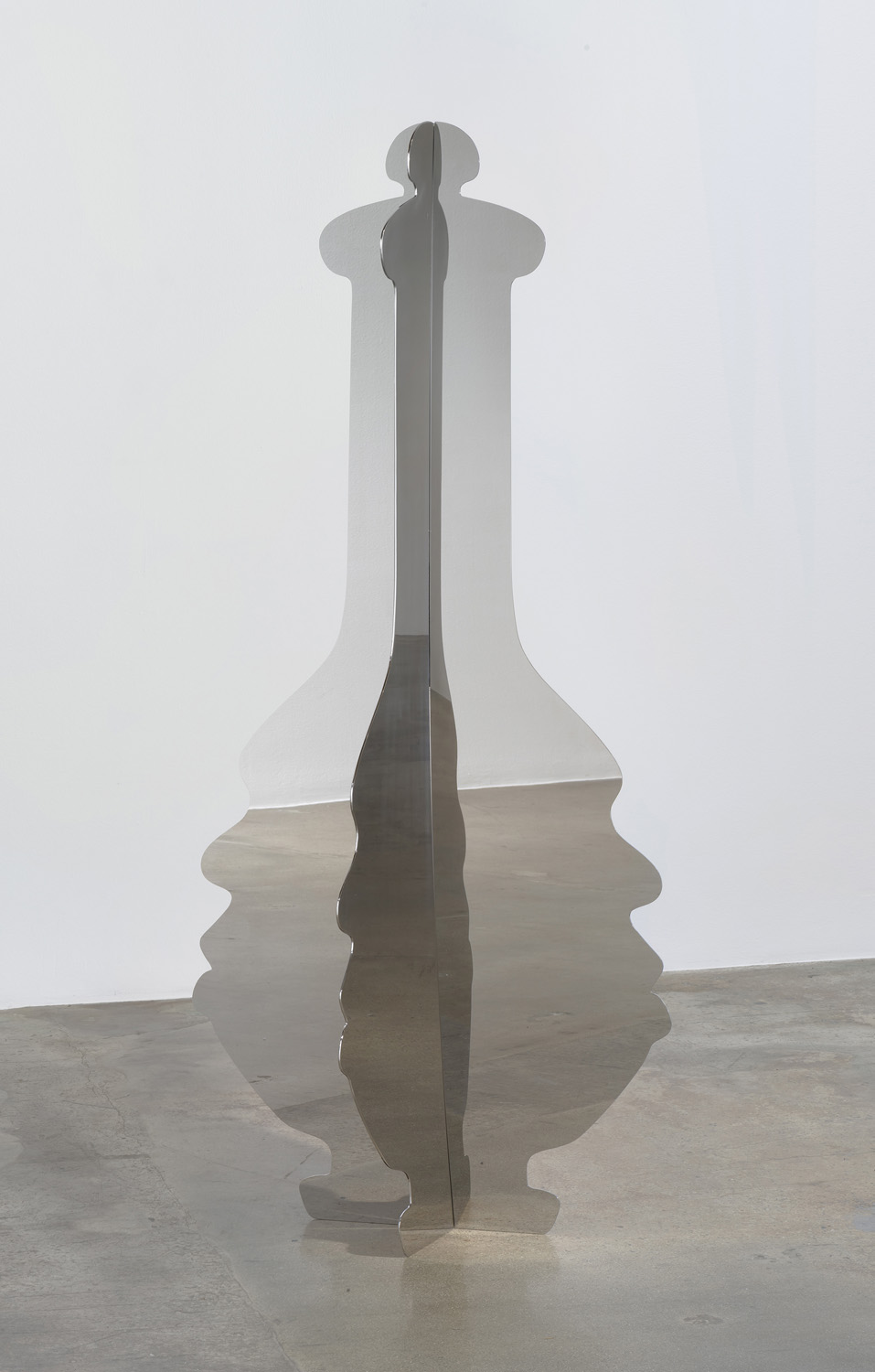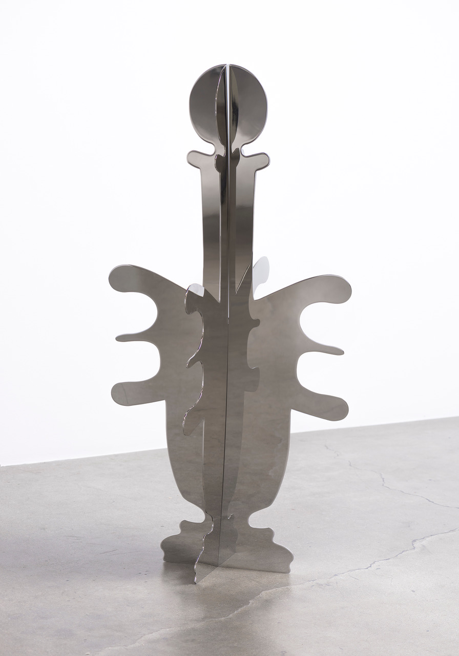 Ehrenburg’s take down of the Surrealists began with a detailed description of a scene from a 1923 Charlie Chaplin film titled A Woman of Paris: A Drama of Fate (which circulated in France with a different title: Public Opinion.) The film is about a woman who finds herself in the middle of a love triangle with a rich playboy and a starving artist. Ultimately, she scorns both and returns to the countryside to take care of orphans. The sets and interiors in the film—Chaplin’s first drama and a critical failure—include a number of urns, vases, and other suggestively feminine, but inanimate forms. Lutker has transposed these “women of Paris” as a group of freestanding mirrored steel sculptures. Exaggerated, abstracted, and anthropomorphized, the shapes take on a new character, stepping out from behind the shadows of the film. At the same time, they are quite literally shadows of their former film-set selves. Here they are collected in one room, reflective and flattened into two intersecting planes. They elude the three dimensions of their source objects, hovering somewhere in between flat and fat.